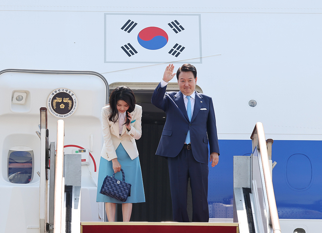 6月19日,韩国城南首尔机场,准备出访法国和越南的韩国总统尹锡悦和第一夫人金建希登上总统专机“空军一号”。(视觉中国)