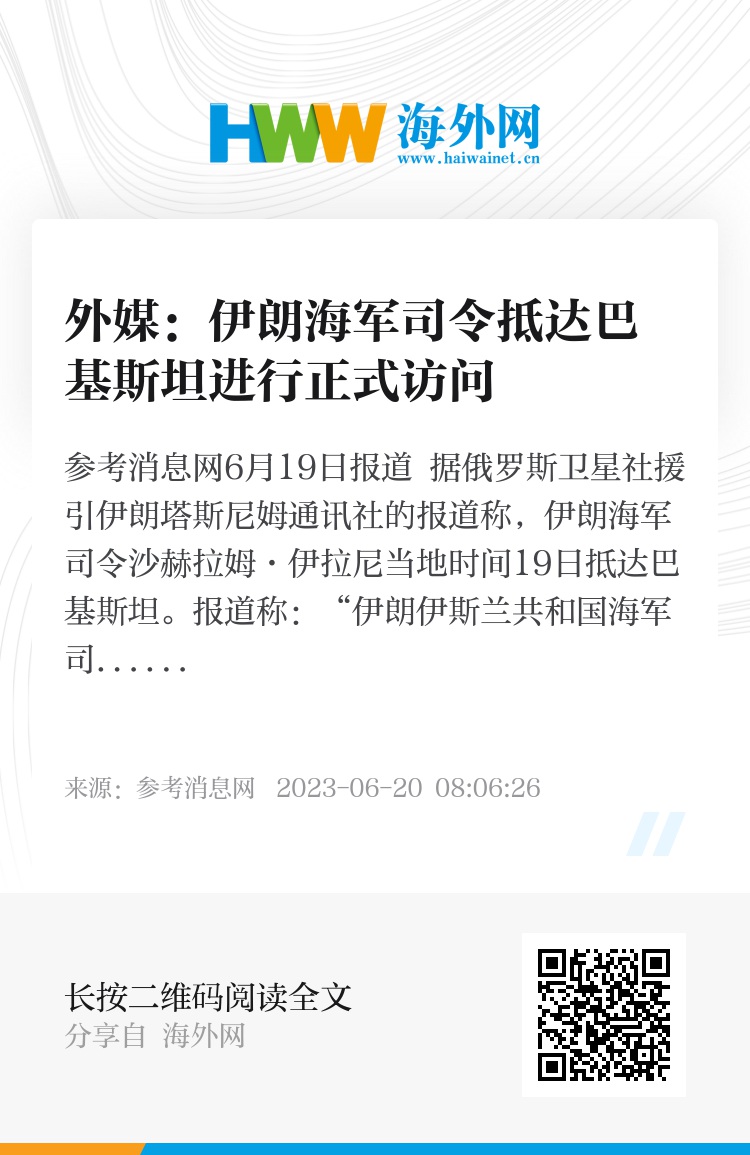 参考消息网6月19日报道 据俄罗斯卫星社援引伊朗塔斯尼姆通讯社的报道称,伊朗海军司令沙赫拉姆·伊拉尼当地时间19日抵达巴基斯坦。