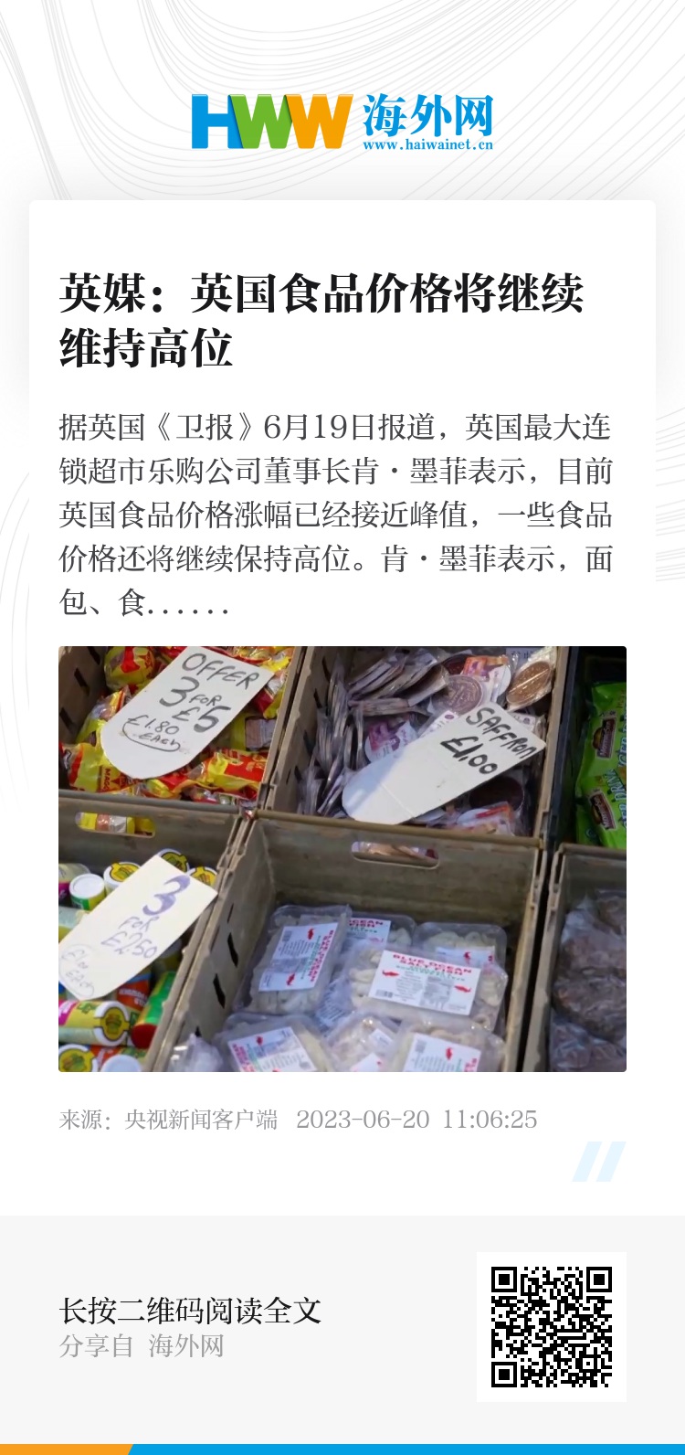 据英国《卫报》6月19日报道,英国最大连锁超市乐购公司董事长肯·墨菲表示,目前英国食品价格涨幅已经接近峰值,一些食品价格还将继续保持高位。