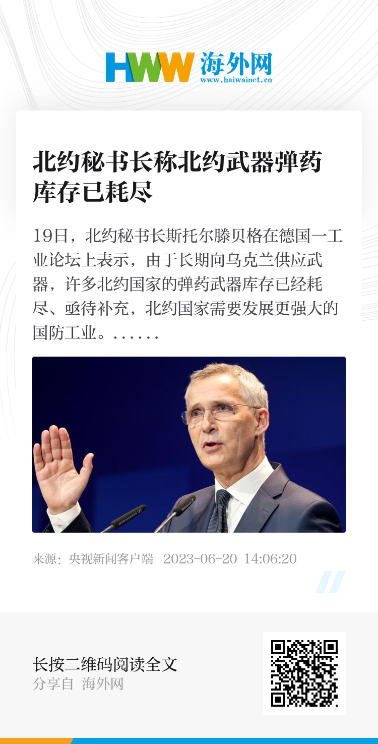 19日,北约秘书长斯托尔滕贝格在德国一工业论坛上表示,由于长期向乌克兰供应武器,许多北约国家的弹药武器库存已经耗尽、亟待补充,北约国家需要发展更强大的国防工业。