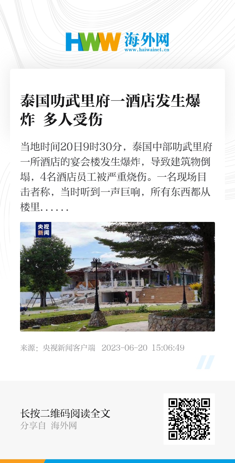 当地时间20日9时30分,泰国中部叻武里府一所酒店的宴会楼发生爆炸,导致建筑物倒塌,4名酒店员工被严重烧伤。一名现场目击者称,当时听到一声巨响,所有东西都从楼里飞了出来,有人满身是血地跑出来。