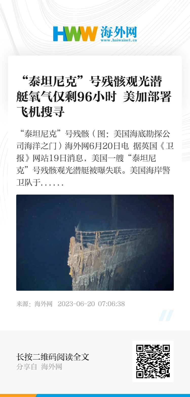 海外网6月20日电 据英国《卫报》网站19日消息,美国一艘“泰坦尼克”号残骸观光潜艇被曝失联。美国海岸警卫队于当地时间19日下午的新闻发布会上表示,失踪潜艇仅剩下96个小时的氧气。