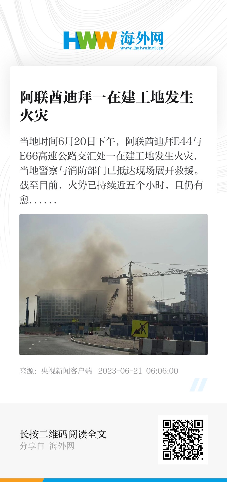 当地时间6月20日下午,阿联酋迪拜E44与E66高速公路交汇处一在建工地发生火灾,当地警察与消防部门已抵达现场展开救援。截至目前,火势已持续近五个小时,且仍有愈演愈烈之势。具体伤亡情况暂不清楚。(总台记者 王寅)