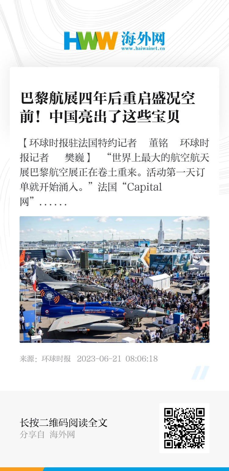 值得关注的是,此次航展也是中国航空工业首次携多型重点航空装备在境外展示。我国航空主战装备在巴黎航展上实现了与世界同代装备同台竞技。