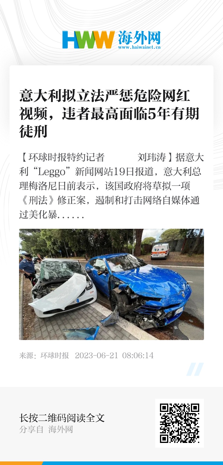 意大利媒体分析认为,此项提议与不久前发生的一起车祸有关。此前,一个叫作“边界线”的网红团体在罗马挑战“连续开车50个小时”,不慎撞死一名男童,在该国引起了轩然大波。