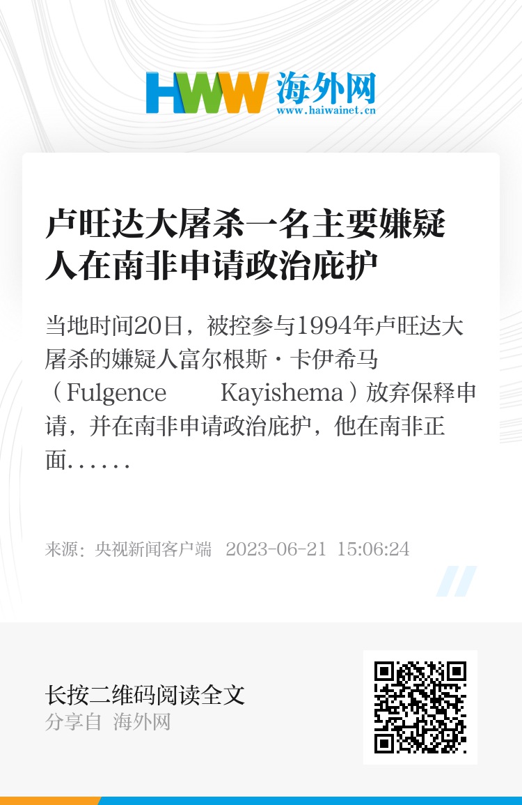 据悉,1994年卢旺达大屠杀期间,卡伊希马在卢旺达一处天主教堂参与杀害了2000多名图西族人,自2001年以来一直逃亡。于今年5月24日在南非帕尔(Paarl)被捕。(总台记者 李雪薇)