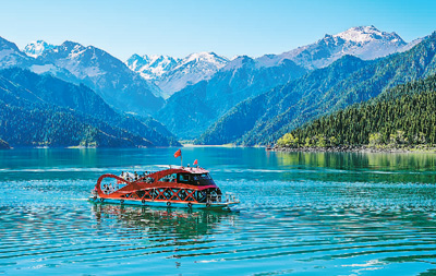 游客乘游轮在新疆维吾尔自治区昌吉回族自治州天山天池风景区游览。陶维明摄(人民图片)