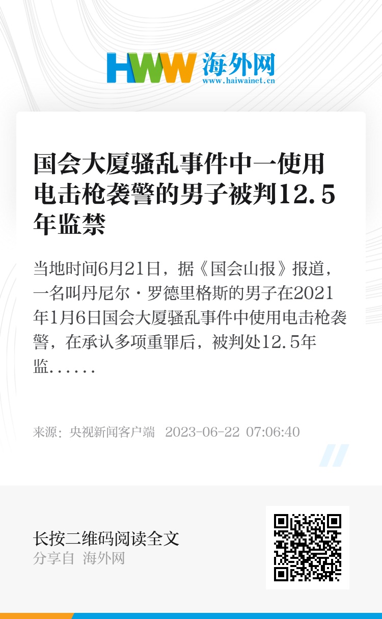 当地时间6月21日,据《国会山报》报道,一名叫丹尼尔·罗德里格斯的男子在2021年1月6日国会大厦骚乱事件中使用电击枪袭警,在承认多项重罪后,被判处12.5年监禁。
