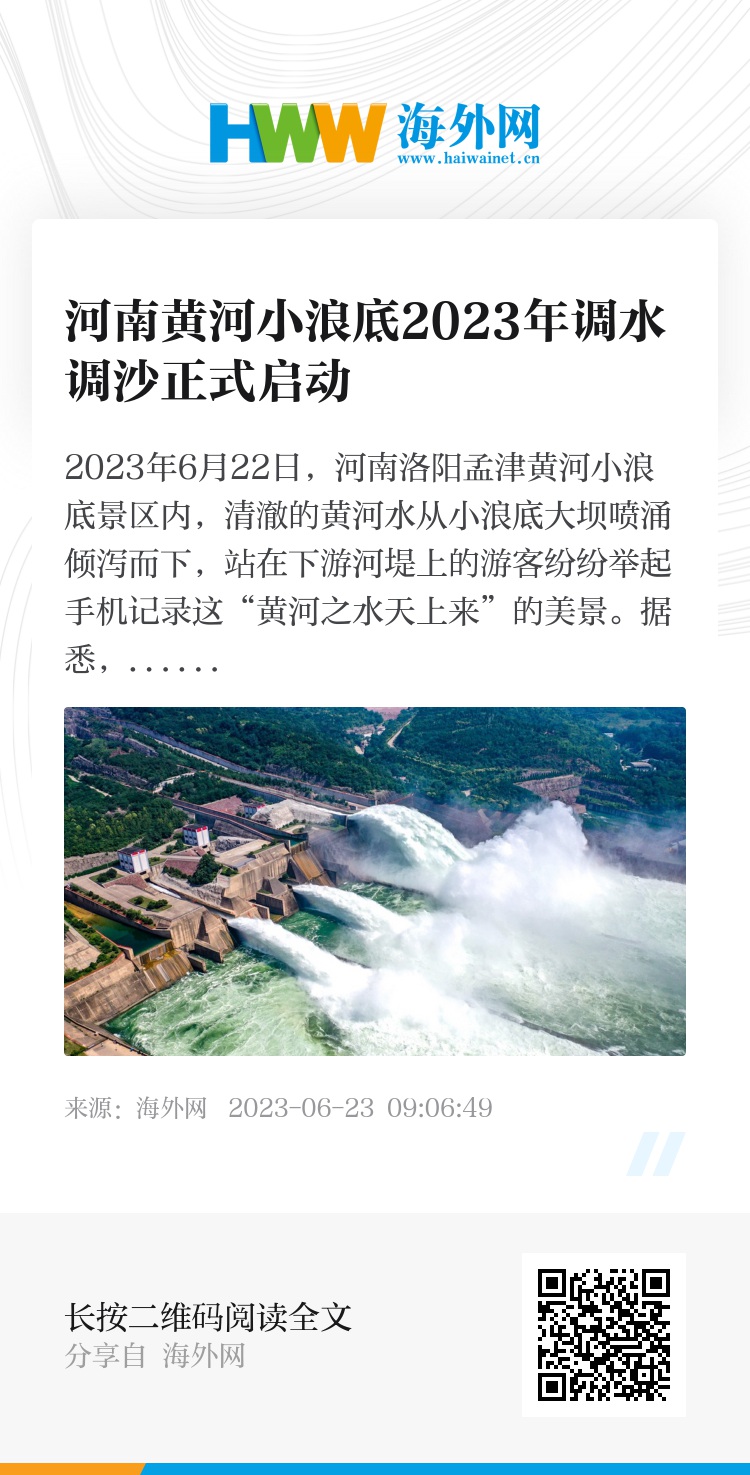 2023年6月22日,河南洛阳孟津黄河小浪底景区内,清澈的黄河水从小浪底大坝喷涌倾泻而下,站在下游河堤上的游客纷纷举起手机记录这“黄河之水天上来”的美景。据悉,2023年度黄河汛前调水调沙于6月21日已经正式启动,预计本次调水调沙将历时20天左右,过几天小浪底倾泻而下的水将变成黄色,又将是另一番美景。图源:IC photo
