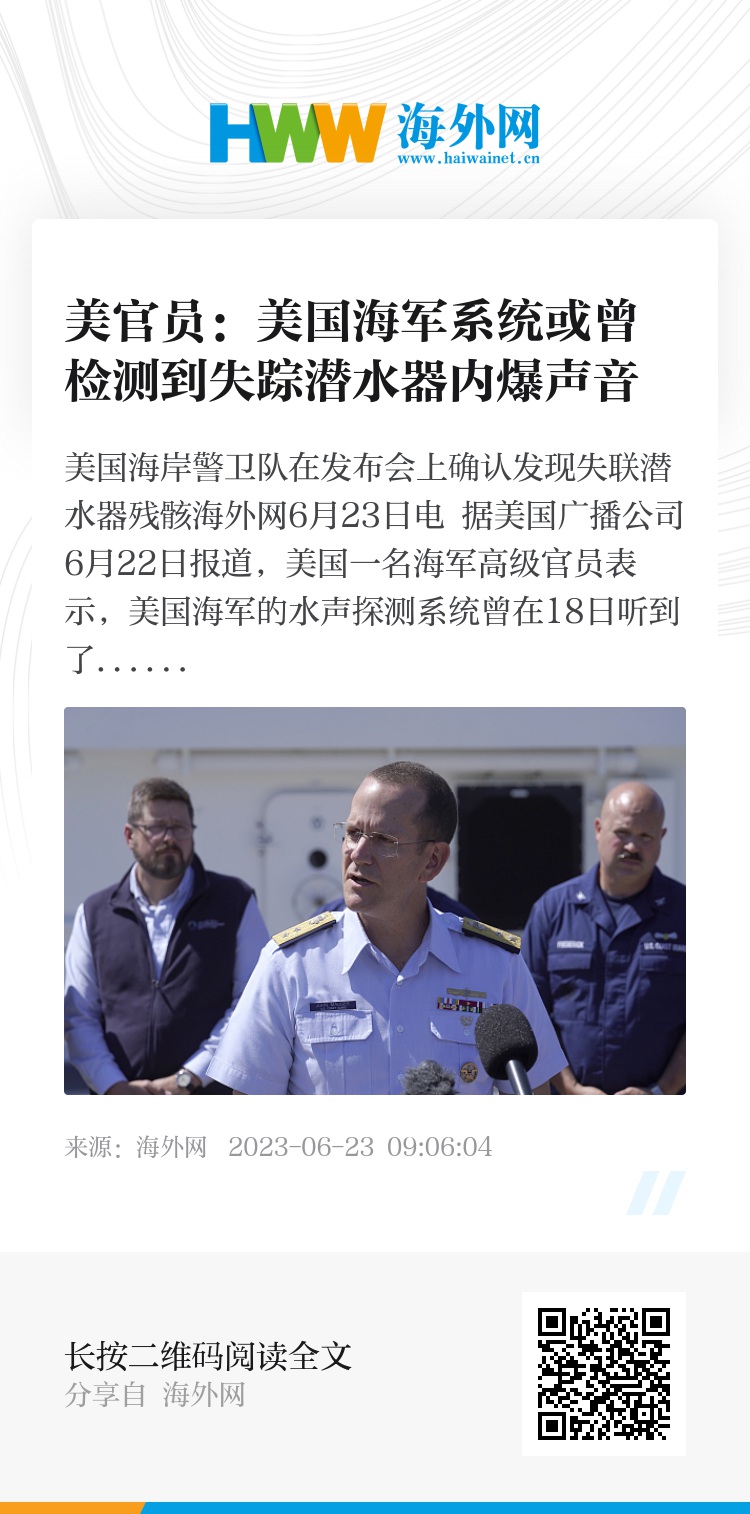 海外网6月23日电 据美国广播公司6月22日报道,美国一名海军高级官员表示,美国海军的水声探测系统曾在18日听到了失踪潜水器可能发生内爆的声音,并立即与美国海岸警卫队进行共享,随后继续进行分析。