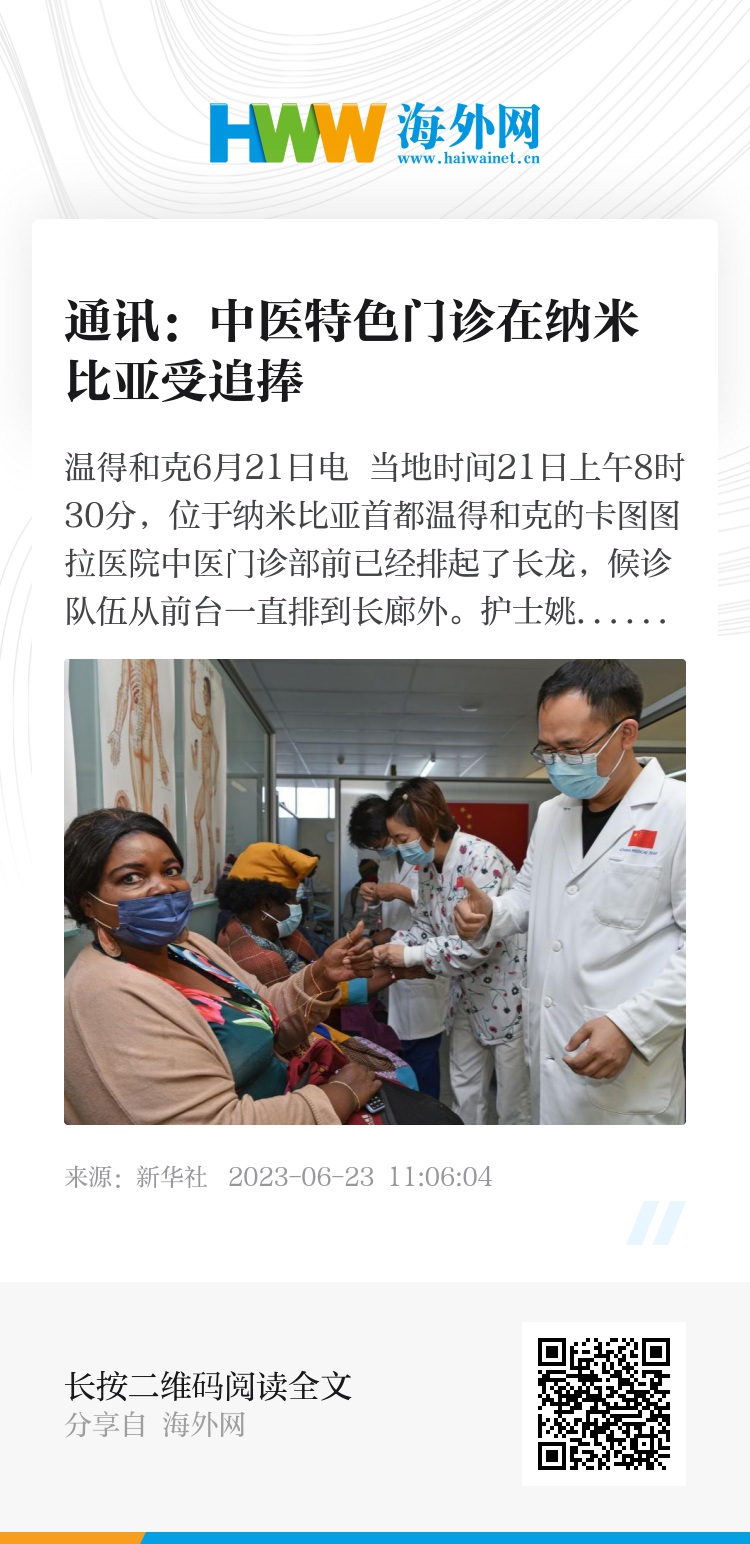 新华社温得和克6月21日电 当地时间21日上午8时30分,位于纳米比亚首都温得和克的卡图图拉医院中医门诊部前已经排起了长龙,候诊队伍从前台一直排到长廊外。护士姚丹告诉记者,从6月开始,这种情况就一直持续。