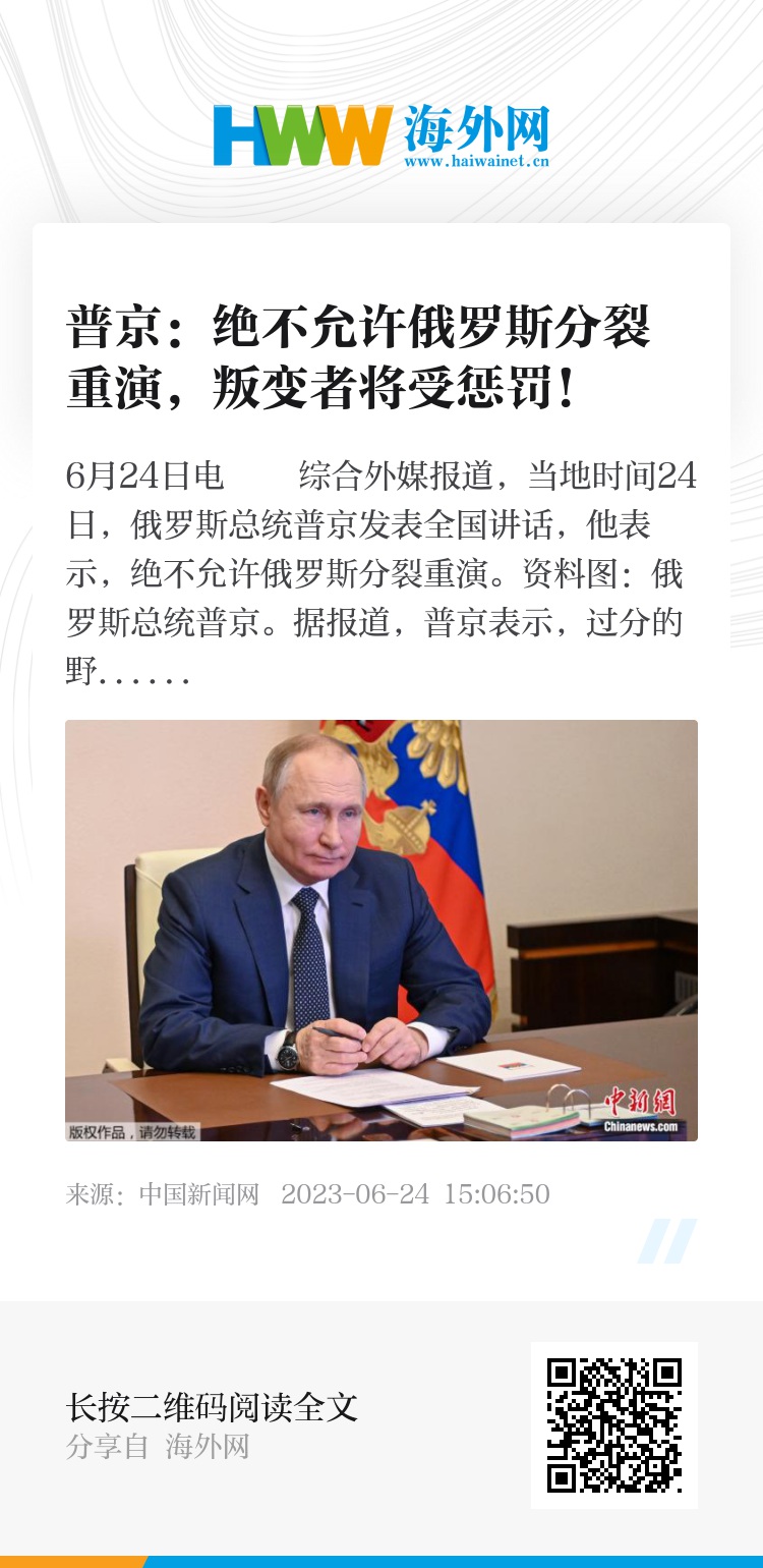 中新网6月24日电 综合外媒报道,当地时间24日,俄罗斯总统普京发表全国讲话,他表示,绝不允许俄罗斯分裂重演。