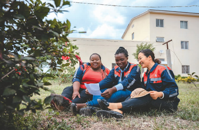 中国师父陈玲(右)是非洲之星铁路运营公司工电部电子设备检修工区工长。在肯尼亚工作4年来,她见证了女学员们电务技术的成长。“现在她们都能独当一面。”陈玲说。朱迪思(左)是陈玲的学员之一,她从师父那里获得的不仅是技术,工作间隙对饮食、文化等多维度的交流同样让她受益匪浅。“我们之间是师徒,更是姐妹。”朱迪思说。图为陈玲在休息时教学员唱中文歌曲。