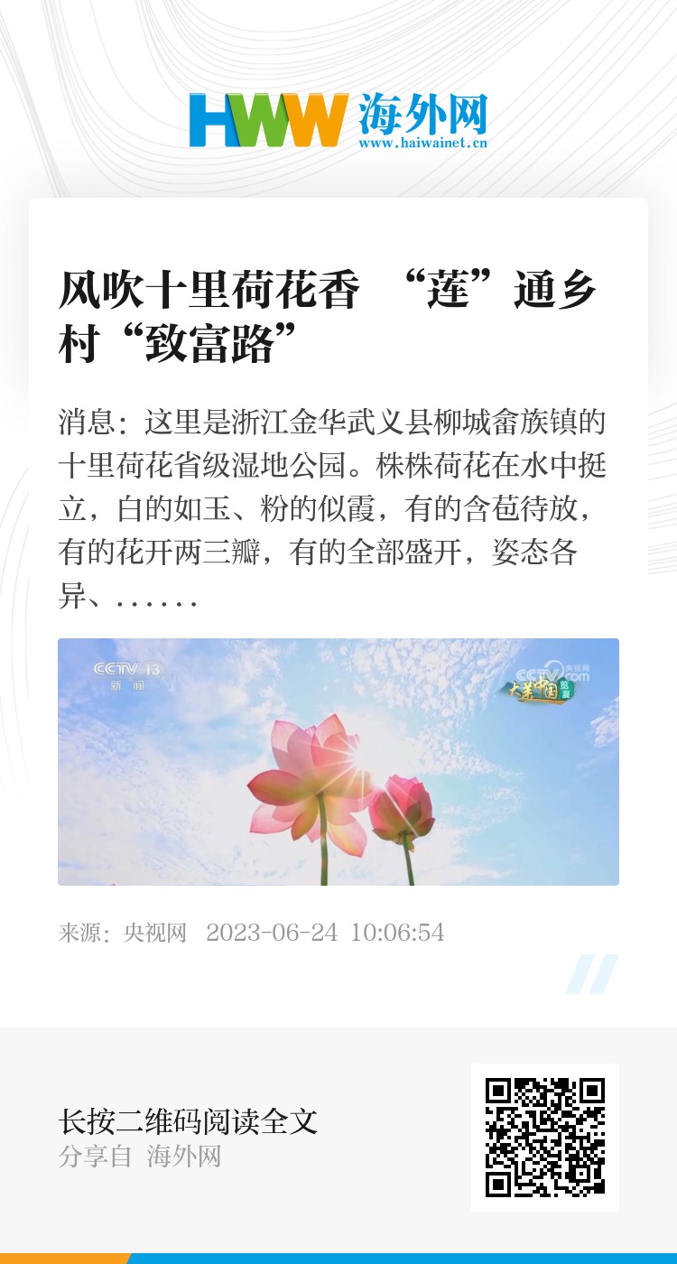央视网消息:这里是浙江金华武义县柳城畲族镇的十里荷花省级湿地公园。株株荷花在水中挺立,白的如玉、粉的似霞,有的含苞待放,有的花开两三瓣,有的全部盛开,姿态各异、美丽动人,吸引着全国各地的游客和摄影爱好者前来观赏、拍照。