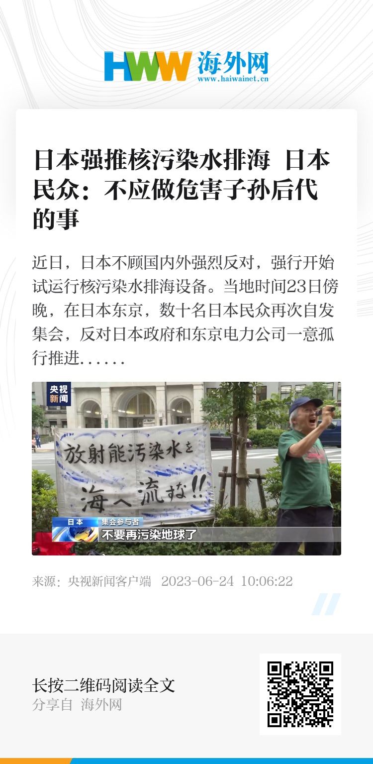 总台报道员 李真:我身后是日本经济产业省总部的大楼,随着福岛核污染水排海工程的推进,日本民众也愈发焦急。今天,日本民众聚集在此进行抗议,坚决反对将核污染水排放入海。