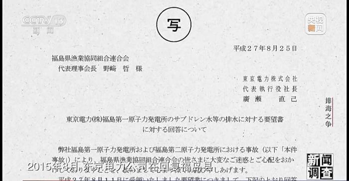 2015年8月,东京电力公司在回复福岛县渔业协作组合联合会的请愿书时做出书面承诺,在得到包括渔业从业者在内的相关人员理解之前,不会对核污染水进行任何处理。