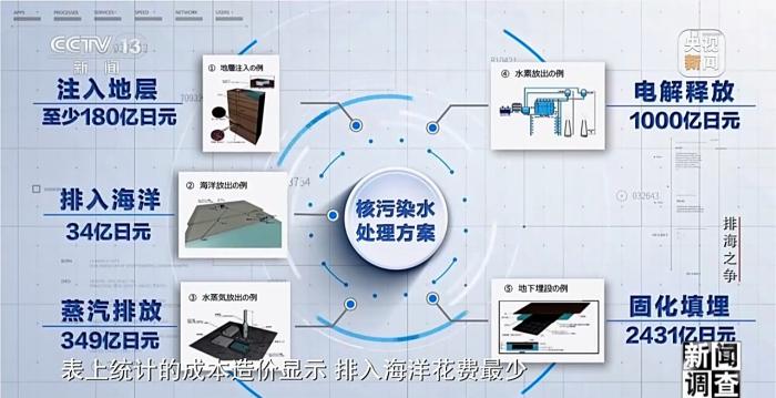 经过两年半的研讨,日本技术委员会总结出了五种处理方案。方案一,注入地层,将污染水注入2500米深左右的地层结构中。方案二,排入海洋,将核污染水稀释或分离放射性物质后排入大海。方案三,蒸汽排放,将核污染水进行蒸发,通过排气管道排入大气。方案四,电解释放,将核污染水进行电解反应将生成的氢气排入大气。方案五,固化填埋,把核污染水和水泥等材料混合成固态后埋入地底。表上统计的成本造价显示,排入海洋花费最少。