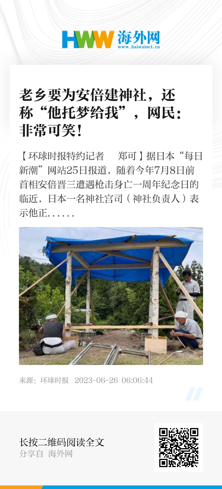 【环球时报特约记者 郑可】据日本“每日新潮”网站25日报道,随着今年7月8日前首相安倍晋三遭遇枪击身亡一周年纪念日的临近,日本一名神社宫司(神社负责人)表示他正在为安倍晋三建造一座神社,称“想要把安倍作为神去祭拜”,而此举在日本社交网络上引起了巨大争议。