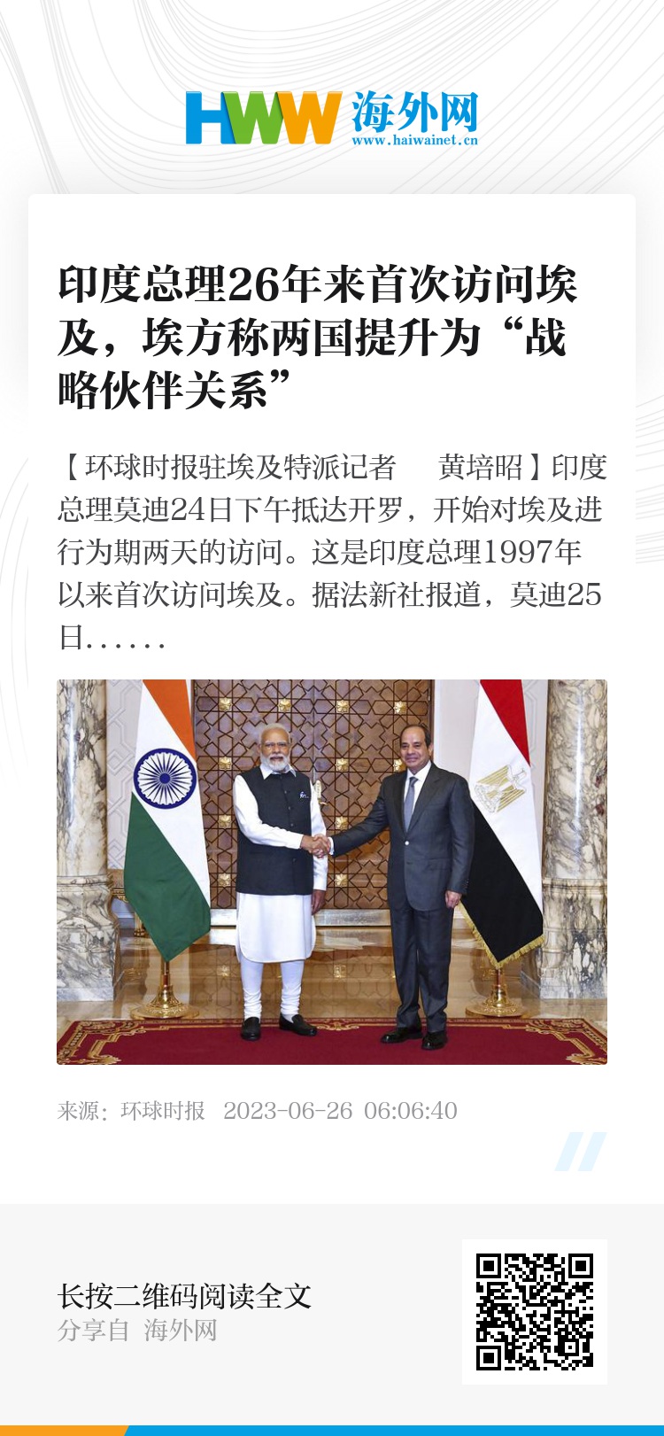 【环球时报驻埃及特派记者 黄培昭】印度总理莫迪24日下午抵达开罗,开始对埃及进行为期两天的访问。这是印度总理1997年以来首次访问埃及。据法新社报道,莫迪25日在开罗会见埃及总统塞西。埃及总统发言人称,二人签署联合声明,将两国关系正式提升为“战略伙伴关系”。