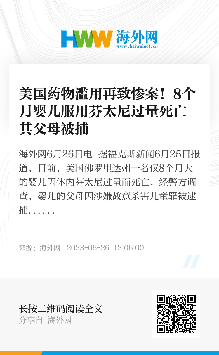 海外网6月26日电 据福克斯新闻6月25日报道,日前,美国佛罗里达州一名仅8个月大的婴儿因体内芬太尼过量而死亡,经警方调查,婴儿的父母因涉嫌故意杀害儿童罪被逮捕。