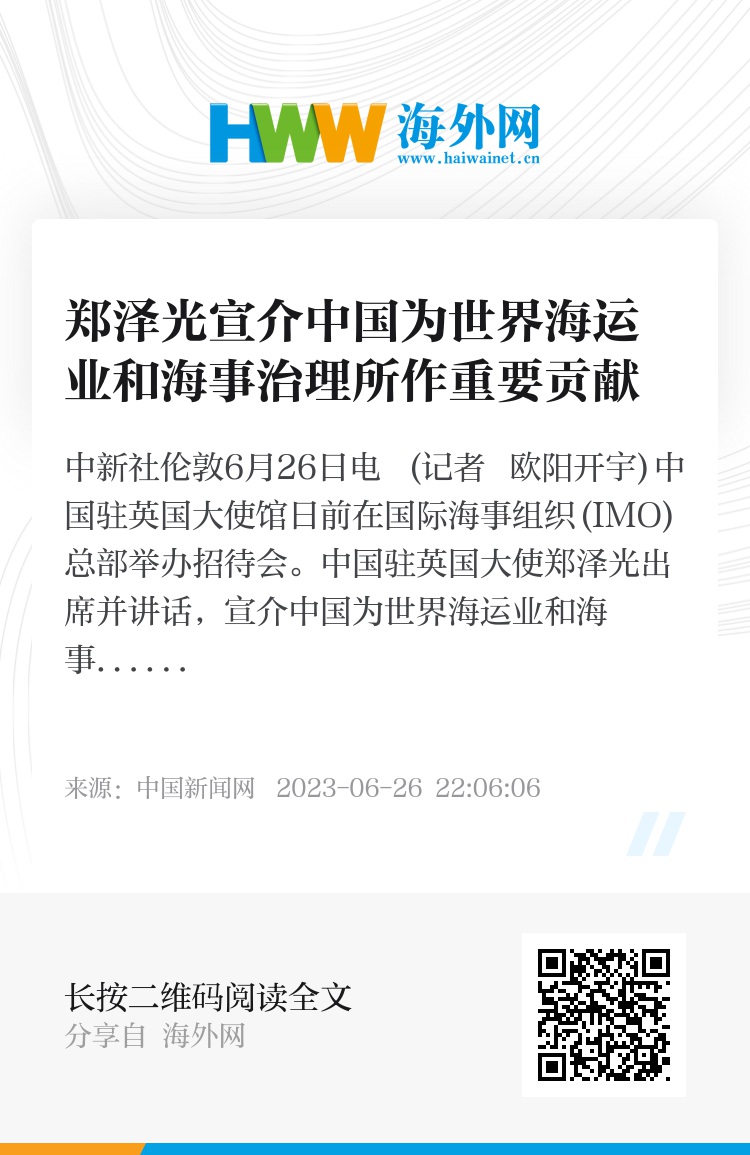 中新社伦敦6月26日电 (记者 欧阳开宇)中国驻英国大使馆日前在国际海事组织(IMO)总部举办招待会。中国驻英国大使郑泽光出席并讲话,宣介中国为世界海运业和海事治理作出的重要贡献。IMO成员国常驻IMO代表和各国驻英外交机构代表约150人出席。