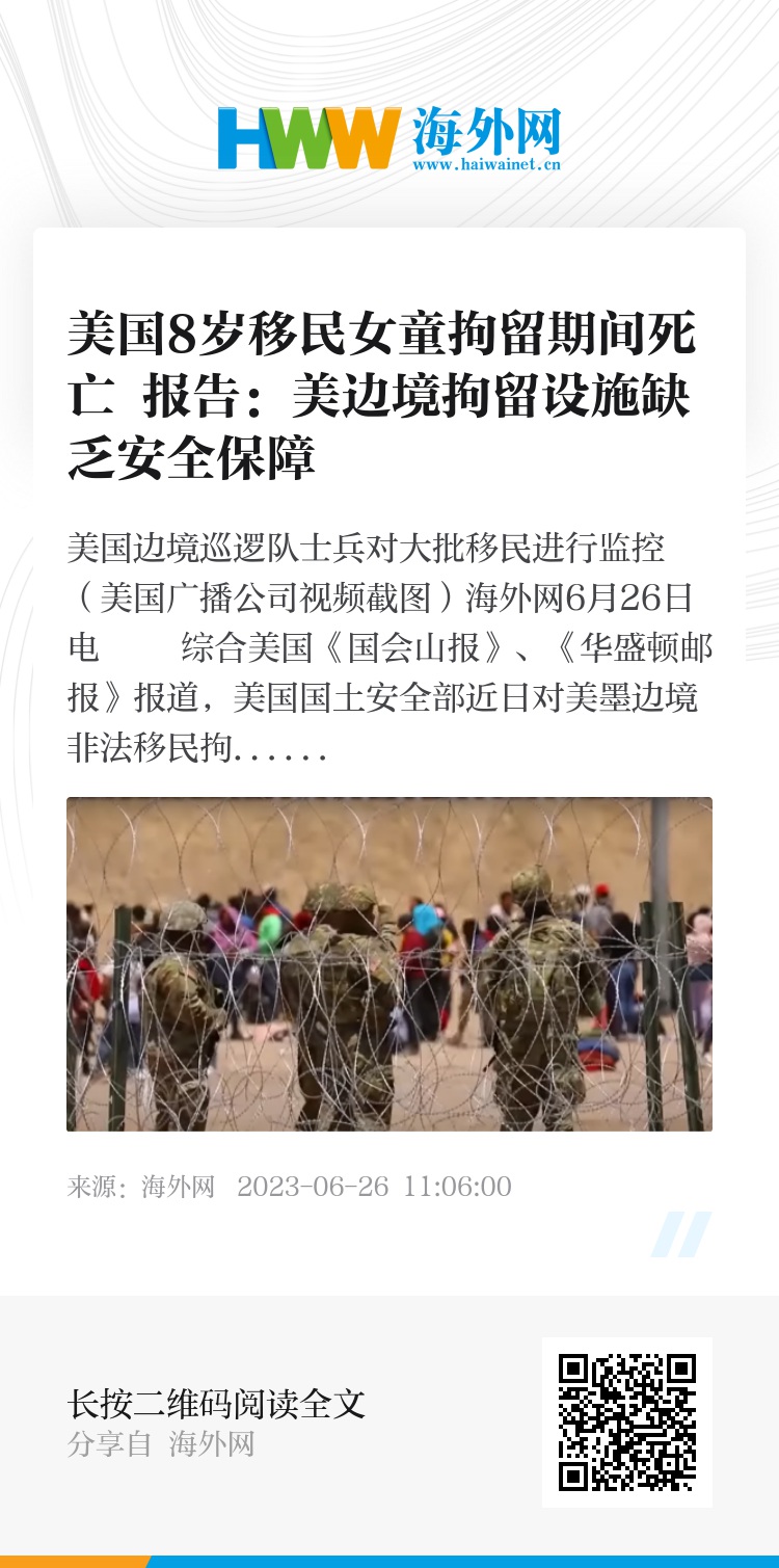 5月17日,美墨边境一名8岁非法移民女童在被美国边境巡逻队拘留期间死亡。此次事故后,美国国土安全部开始对边境的非法移民拘留设施进行调查。