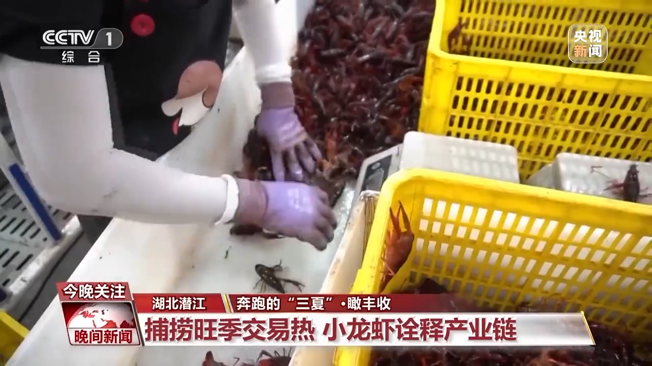 湖北潜江后湖管理区,拉出水面的小龙虾欢腾起来。它们被送到全国最大的小龙虾交易中心,在这里分拣打包,踏上全球旅程。潜江每天发出1500吨小龙虾,差不多七八千万只。每年还有约300万游客来潜江一饱口福。小龙虾助力着乡村振兴的产业链。