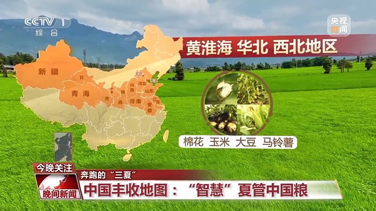 小麦收完了,现在的田野里种的是什么呢?让我们再次打开丰收地图,如今的中国耕地上,东北地区种着水稻、玉米、大豆等作物;黄淮海、华北、西北地区则生长着棉花、玉米、大豆、马铃薯;而江南、华南耕种的是水稻;到了西南地区则主要是玉米和水稻。无论东南西北,它们都是秋天里丰收的希望。