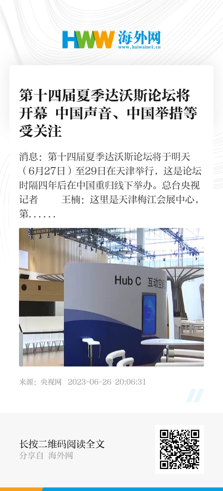 总台央视记者 王楠:这里是天津梅江会展中心,第十四届夏季达沃斯论坛在这里设置了新领军者村、会议区等多个区域。其中,在新领军者村,我们看到这里设置了6个半开放式的互动空间,每个空间里都配备了新媒体设备。论坛期间,仅在这里就将举办49场活动,与会嘉宾将在这里探讨前沿科技、能源和可持续发展等领域话题。