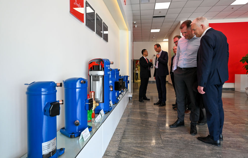 5月10日,在丹佛斯全球制冷研发测试中心,参观人员参观商用压缩机。 新华社记者 孙凡越 摄