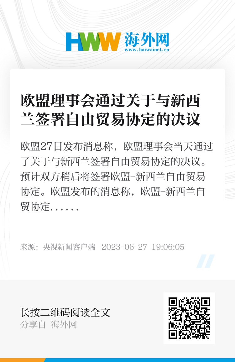 欧盟27日发布消息称,欧盟理事会当天通过了关于与新西兰签署自由贸易协定的决议。预计双方稍后将签署欧盟-新西兰自由贸易协定。