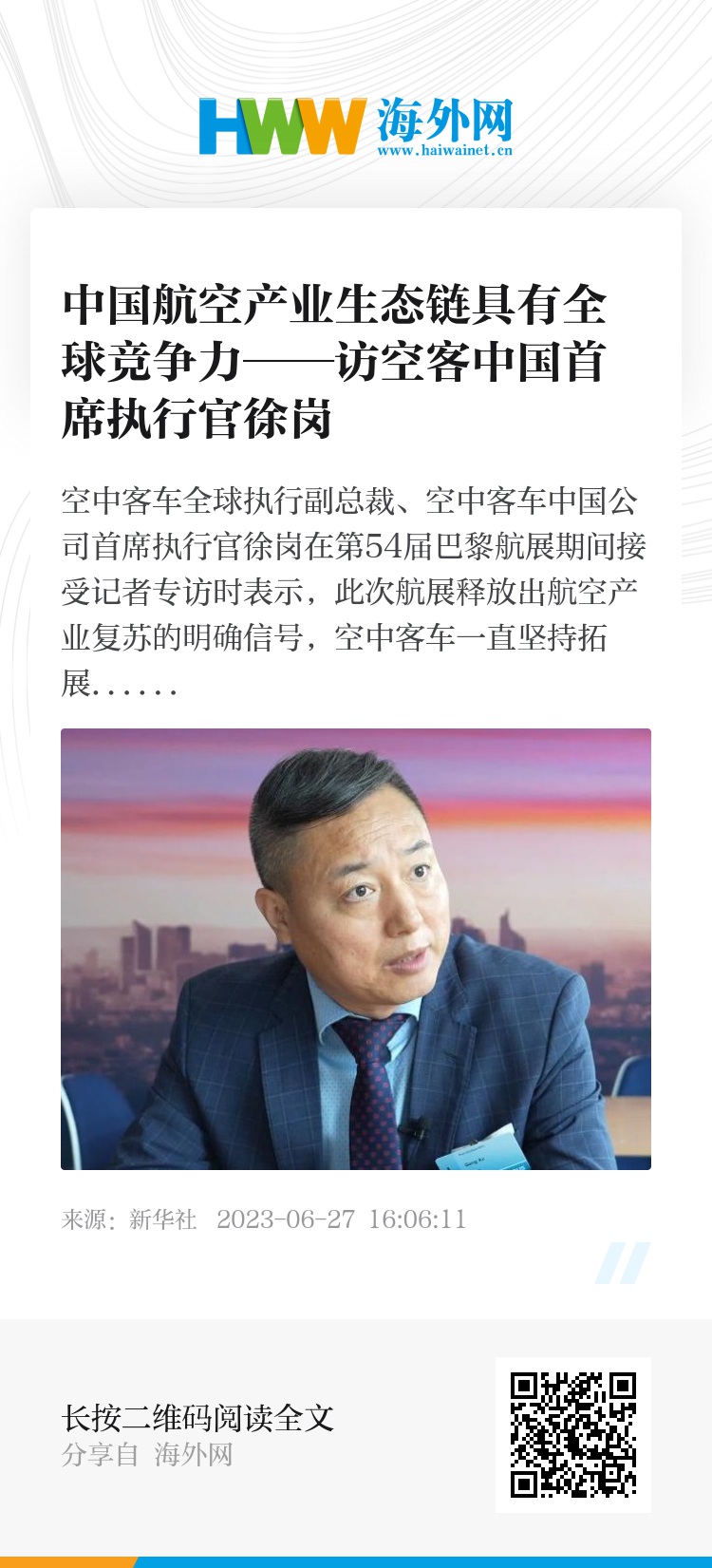 空中客车全球执行副总裁、空中客车中国公司首席执行官徐岗在第54届巴黎航展期间接受新华社记者专访时表示,此次航展释放出航空产业复苏的明确信号,空中客车一直坚持拓展中国市场,中国航空产业生态链具有全球竞争力,也将在航空业去碳化进程中迎来新的机遇。