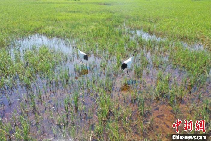 国家一级保护鸟类丹顶鹤在湿地中觅食。 梁永峰 摄