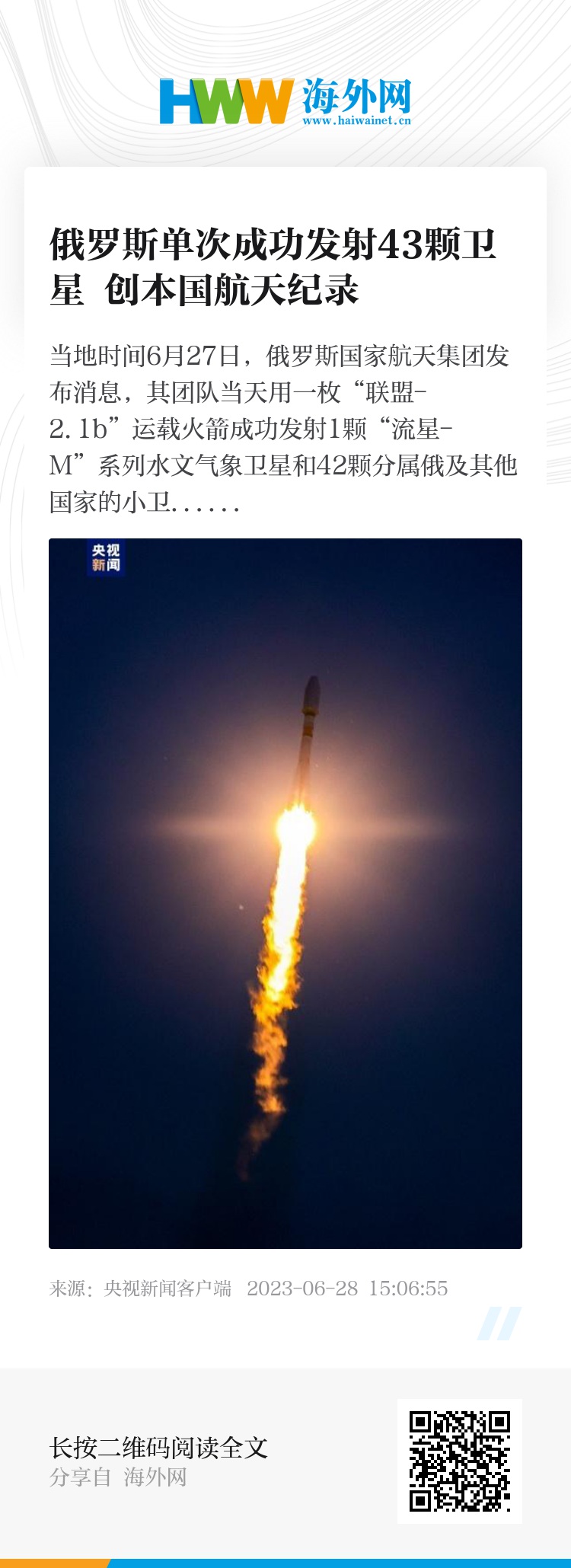 当地时间6月27日,俄罗斯国家航天集团发布消息,其团队当天用一枚“联盟-2.1b”运载火箭成功发射1颗“流星-M”系列水文气象卫星和42颗分属俄及其他国家的小卫星。此次俄单枚火箭成功发射的俄罗斯卫星数量之多,在本国航天史上创下纪录。