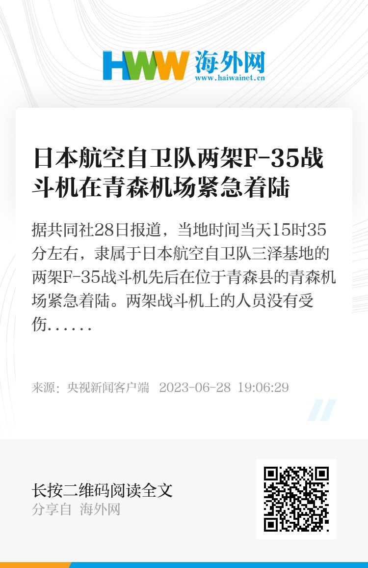 据共同社28日报道,当地时间当天15时35分左右,隶属于日本航空自卫队三泽基地的两架F-35战斗机先后在位于青森县的青森机场紧急着陆。两架战斗机上的人员没有受伤,目前尚不清楚紧急着陆的原因。受事件影响,青森机场跑道一度关闭。(总台记者 李卫兵)