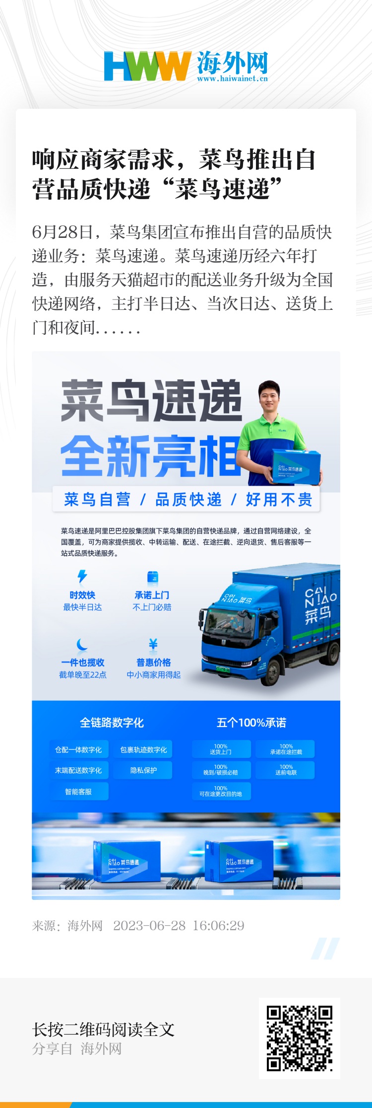 6月28日,菜鸟集团宣布推出自营的品质快递业务:菜鸟速递。