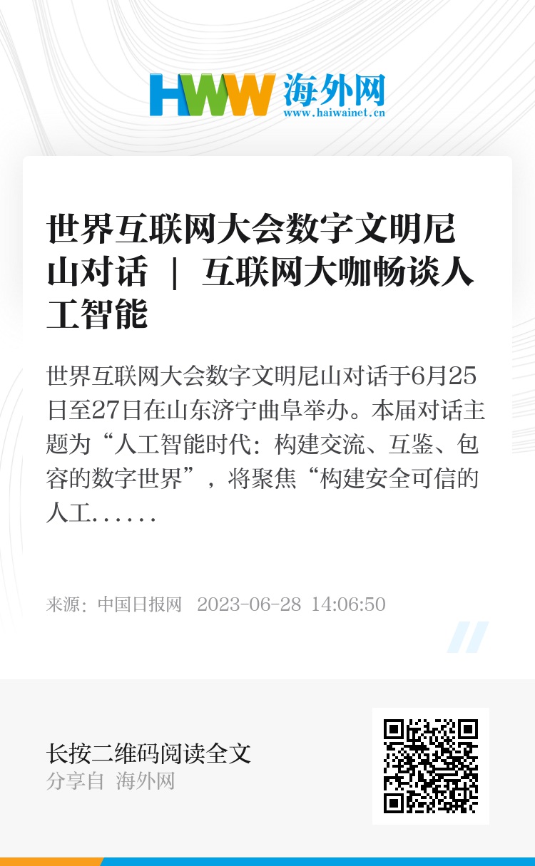 世界互联网大会数字文明尼山对话于6月25日至27日在山东济宁曲阜举办。本届对话主题为“人工智能时代:构建交流、互鉴、包容的数字世界”,将聚焦“构建安全可信的人工智能”“人工智能赋能千行百业”“人工智能时代人类文明向何处去”等议题。在会议上,多位互联网大咖热议人工智能的发展趋势,畅谈人工智能给人类带来的机遇和挑战。跟随中国日报网的视频,一睹为快!
