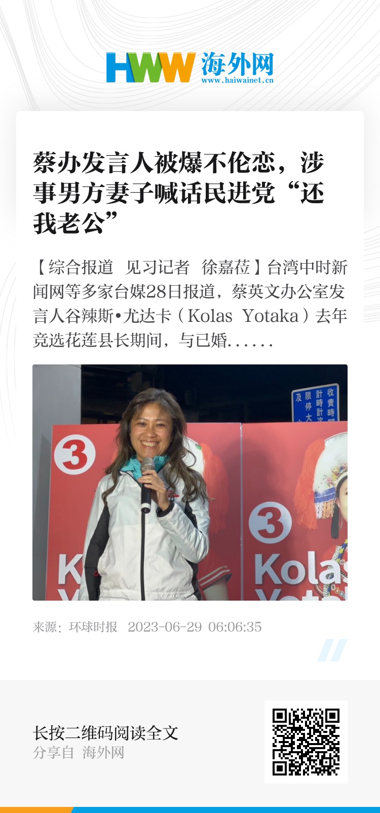 【环球网综合报道 见习记者 徐嘉莅】台湾中时新闻网等多家台媒28日报道,蔡英文办公室发言人谷辣斯•尤达卡(Kolas Yotaka)去年竞选花莲县长期间,与已婚李姓男保镖陷入不伦恋,李姓男子妻子28日在脸书喊话蔡英文、赖清德主持公道,并表示民进党“还我老公”!该事件在岛内引发议论,有网友表示:“民进党的发言人,就是要会说谎。”