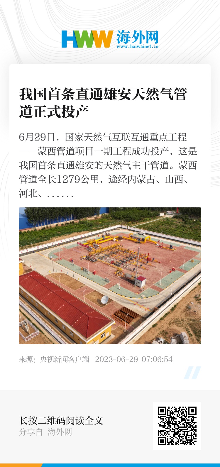 6月29日,国家天然气互联互通重点工程——蒙西管道项目一期工程成功投产,这是我国首条直通雄安的天然气主干管道。
