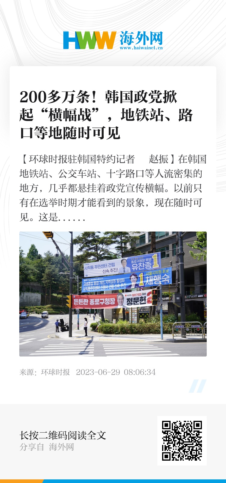 【环球时报驻韩国特约记者 赵振】在韩国地铁站、公交车站、十字路口等人流密集的地方,几乎都悬挂着政党宣传横幅。以前只有在选举时期才能看到的景象,现在随时可见。这是因为去年12月韩国修改并实施法律,政党无需申报就可以悬挂宣传横幅,且不受数量和场地限制。然而,这却让韩国陷入了一场政党间的“横幅战”,并由此引发诸多问题。