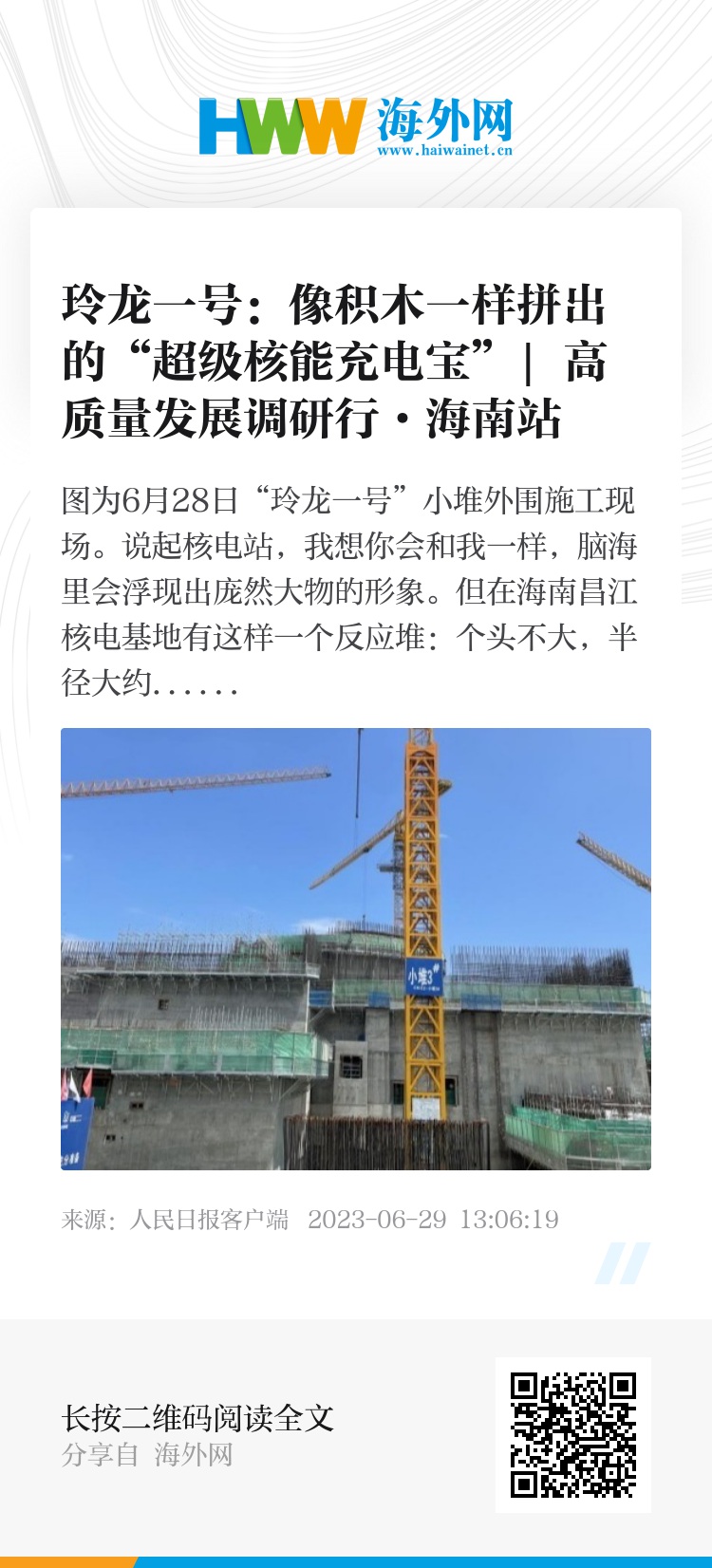 据了解,截至目前海南核电一期工程累计发电量超过650亿千瓦时,约占同期海南省用电总量的1/3左右,为海南自贸港建设提供了安全稳定清洁的电力供应。“玲龙一号”多用途模块式小型堆科技示范项目于2021年7月13日正式开工,目前小堆工程各项工作有序开展,已完成70%的土建工程量,安全、质量、进度总体受控,将于年内迎来压力容器吊装、穹顶吊装等重要工程节点。