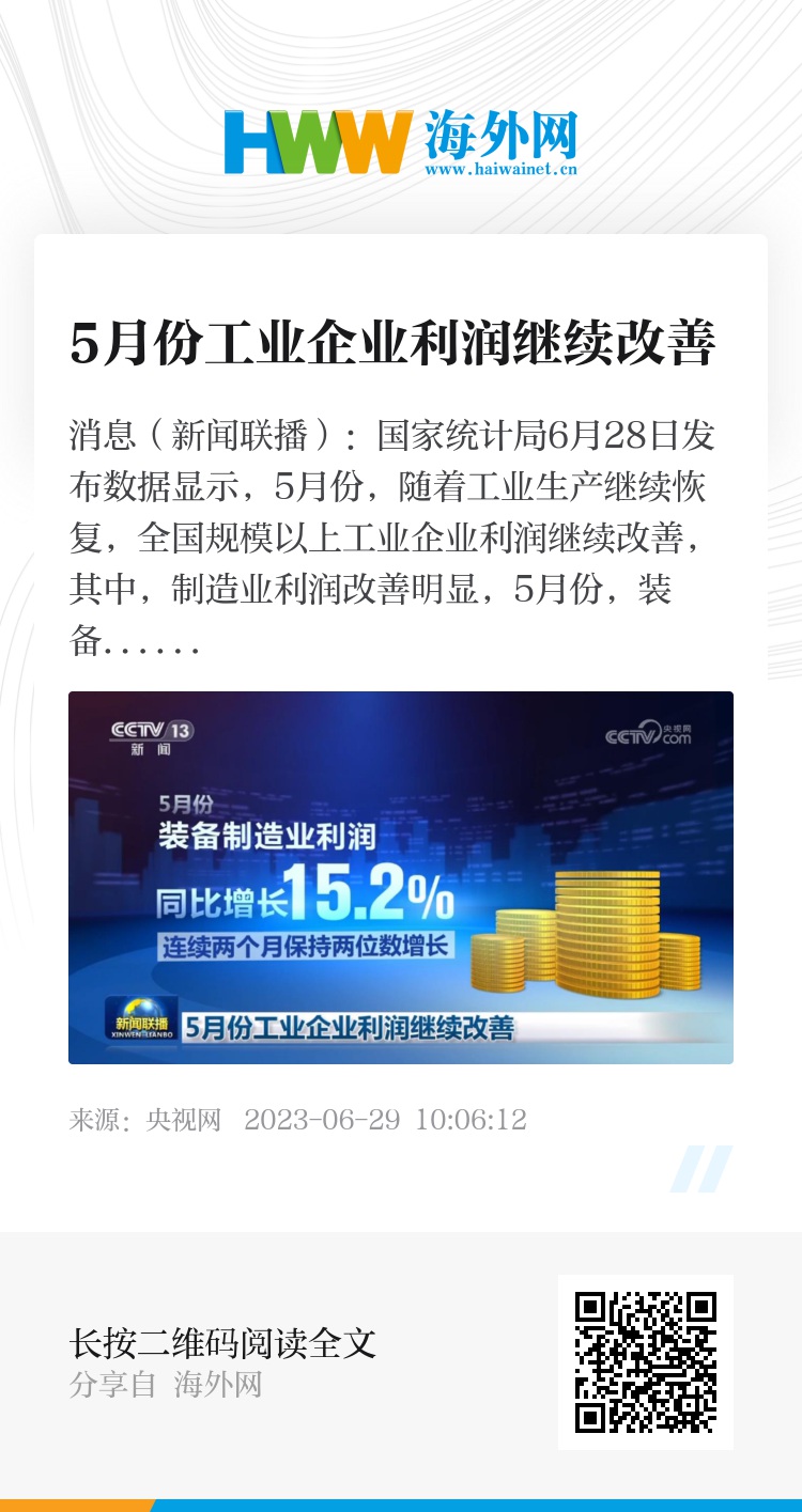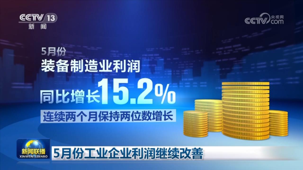 央视网消息(新闻联播):国家统计局6月28日发布数据显示,5月份,随着工业生产继续恢复,全国规模以上工业企业利润继续改善,其中,制造业利润改善明显,5月份,装备制造业利润同比增长15.2%,连续两个月保持两位数增长。