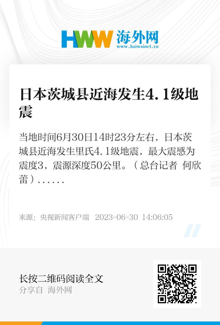 当地时间6月30日14时23分左右,日本茨城县近海发生里氏4.1级地震,最大震感为震度3,震源深度50公里。(总台记者 何欣蕾)