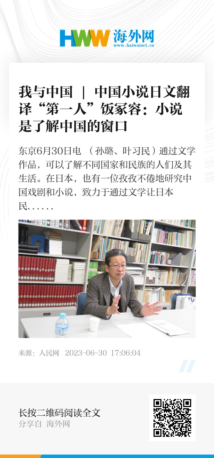 人民网东京6月30日电 (孙璐、叶习民)通过文学作品,可以了解不同国家和民族的人们及其生活。在日本,也有一位孜孜不倦地研究中国戏剧和小说,致力于通过文学让日本民众了解中国的学者,他就是中央大学教授饭冢容。