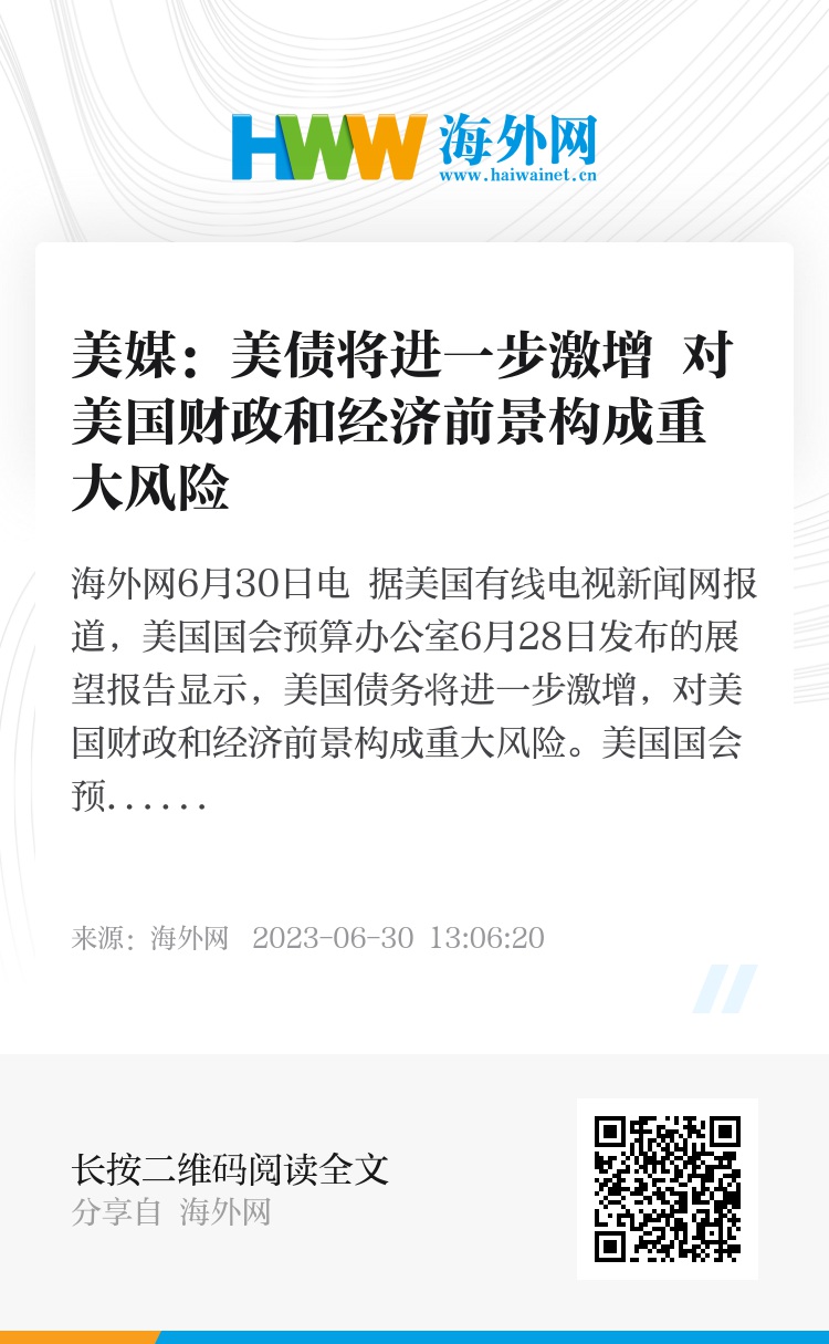 海外网6月30日电 据美国有线电视新闻网报道,美国国会预算办公室6月28日发布的展望报告显示,美国债务将进一步激增,对美国财政和经济前景构成重大风险。