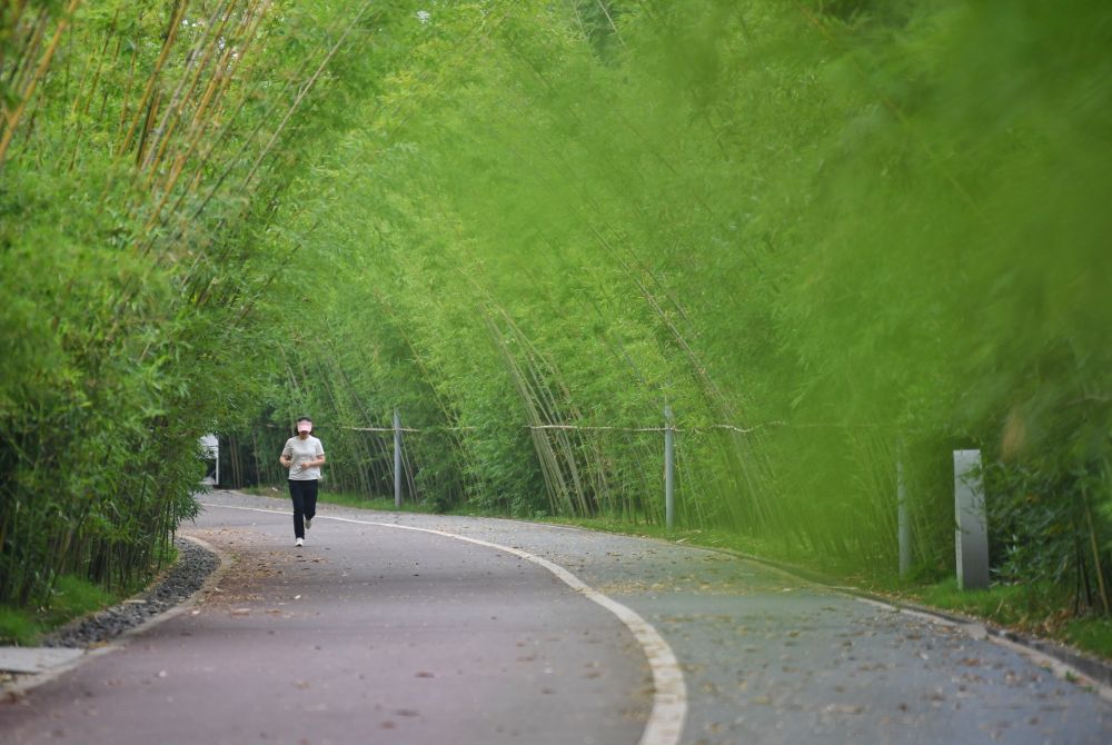 在四川省宜宾市江安县长江竹岛,市民在由河中村改造成的绿色生态公园里跑步(2023年5月31日摄)。新华社记者 刘坤 摄