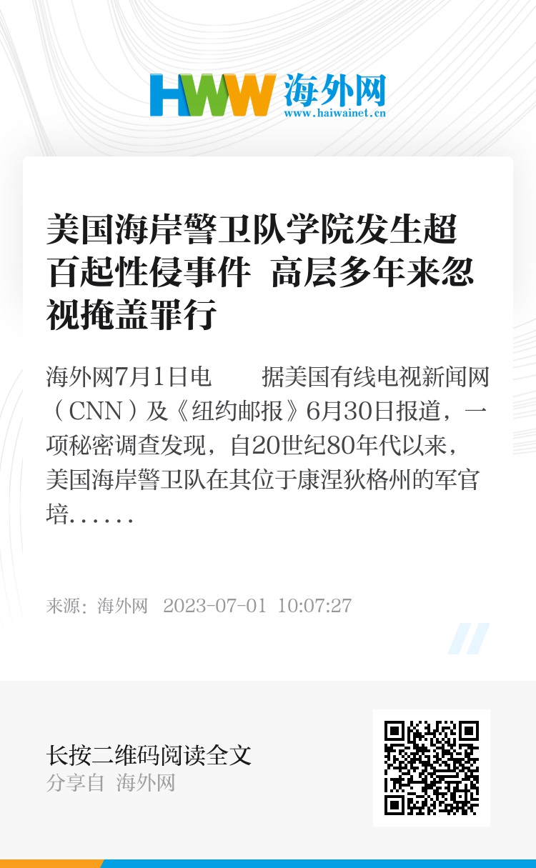海外网7月1日电 据美国有线电视新闻网(CNN)及《纽约邮报》6月30日报道,一项秘密调查发现,自20世纪80年代以来,美国海岸警卫队在其位于康涅狄格州的军官培训学院掩盖了100多起性侵事件。校方高层为了声誉选择忽视或掩盖这些罪行。