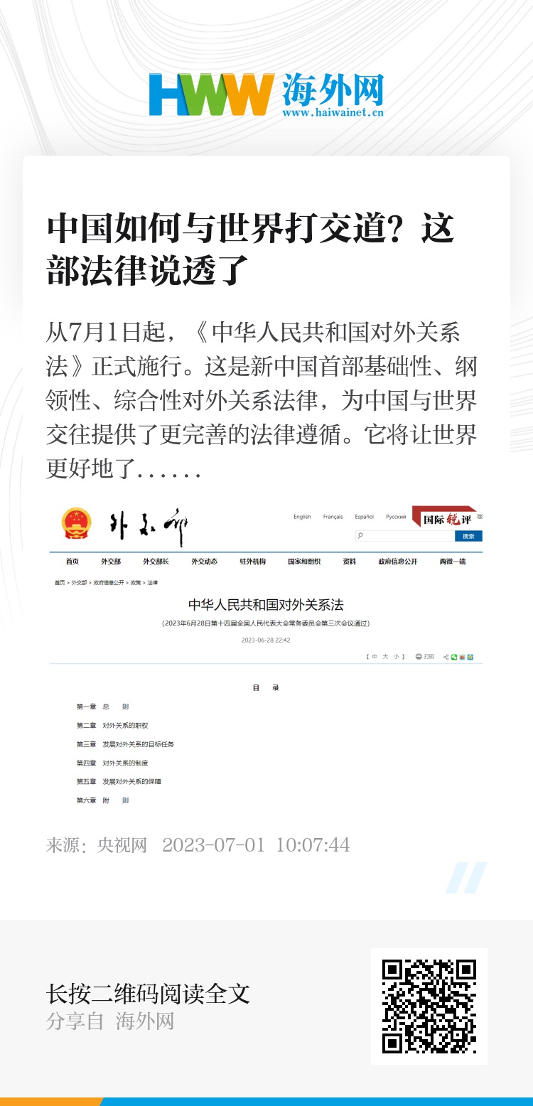 从7月1日起,《中华人民共和国对外关系法》正式施行。这是新中国首部基础性、纲领性、综合性对外关系法律,为中国与世界交往提供了更完善的法律遵循。它将让世界更好地了解中国,了解中国推动构建人类命运共同体的坚定信念,了解中国维护国家主权、安全和发展利益以及国际公平正义的决心和担当。新加坡《联合早报》引述专家的话评价说,这部法律展现了中国外交政策原则,将中国执政党领导外交事务的论述以法律形式进行了确立。