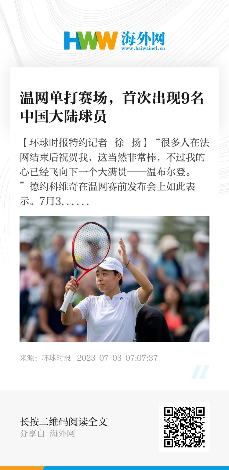 除了张之臻与吴易昺,女单赛场将迎来7名中国选手——共9名中国大陆球员出战温网单打正赛,也是历史首次。首日比赛中,将有5名中国选手亮相,她们都将遭遇强大的对手:朱琳将迎战世界排名第一的波兰名将斯瓦泰克,郑钦文的对手是7届大满贯双打冠军西尼亚科娃,袁悦将迎战大满贯两冠王阿扎伦卡,王欣瑜对阵本土球员亨特,张帅迎战20号种子维基奇。
