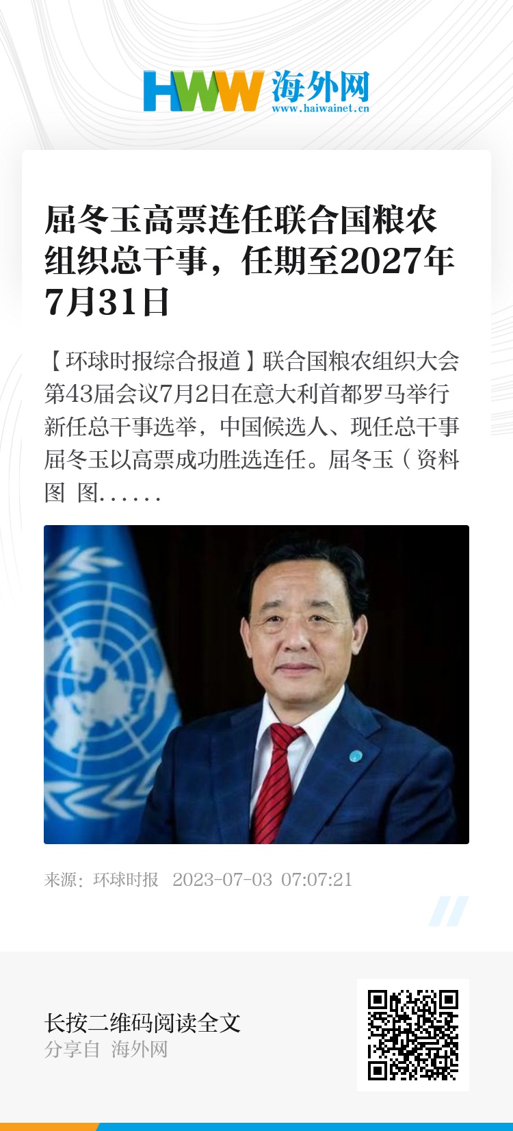 据意大利安莎社2日报道,屈冬玉当天再次当选联合国粮农组织总干事。在粮农组织成员国的投票中,屈冬玉共获得182票中的168票。由中国提名的屈冬玉是此次粮农组织最高职位选举中的唯一候选人。他的新任期将从2023年8月1日至2027年7月31日。